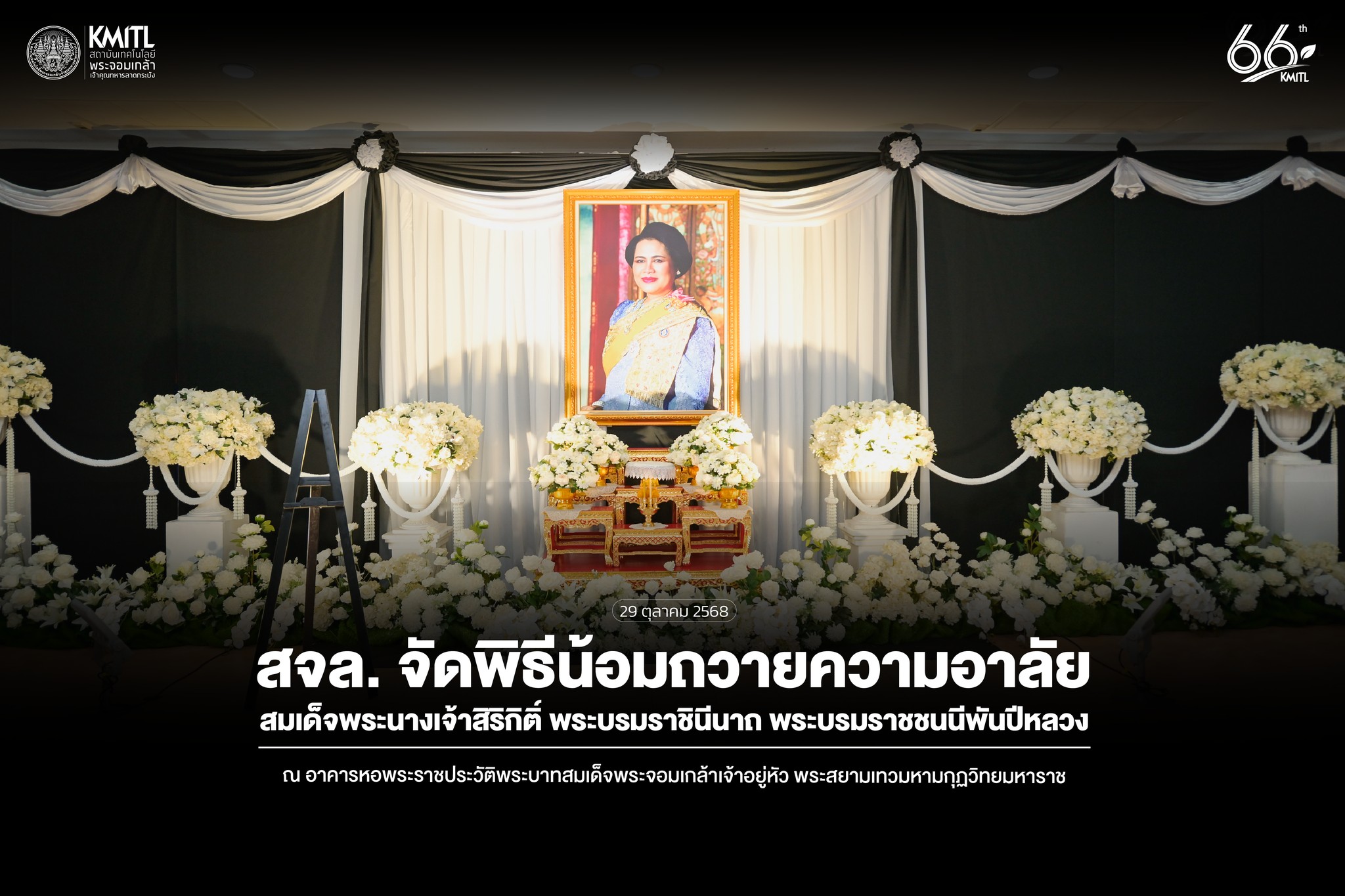 วันพุธที่ ๒๙ ตุลาคม ๒๕๖๘ รศ. ดร.คมสัน มาลีสี อธิการบดี พร้อมด้วยคณะผู้บริหาร และบุคลากร สถาบันเทคโนโลยีพระจอมเกล้าเจ้าคุณทหารลาดกระบัง เข้าร่วมพิธีลงนามถวายความอาลัย ถวายมาลัย วางพวงมาลา และน้อมรำลึกในพระมหากรุณาธิคุณ สมเด็จพระนางเจ้าสิริกิติ์ พระบรมราชินีนาถ พระบรมราชชนนีพันปีหลวง เพื่อสำนึกในพระมหากรุณาธิคุณอันหาที่สุดมิได้ ที่ทรงบำเพ็ญพระราชกรณียกิจนานัปการ อุทิศพระวรกาย พระปรีชาสามารถ และพระเมตตาธิคุณ เพื่อประโยชน์สุขแห่งปวงชนชาวไทย ณ อาคารนวัตกรรมเฉลิมพระเกียรติ (เรือนไทย) สถาบันเทคโนโลยีพระจอมเกล้าเจ้าคุณทหารลาดกระบัง
