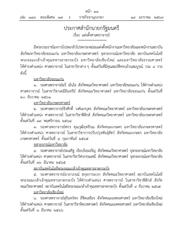แต่งตั้งให้ดำรงตำแหน่ง "ศาสตราจารย์" ในสาขาวิชาฟิสิกส์ สังกัดคณะวิทยาศาสตร์