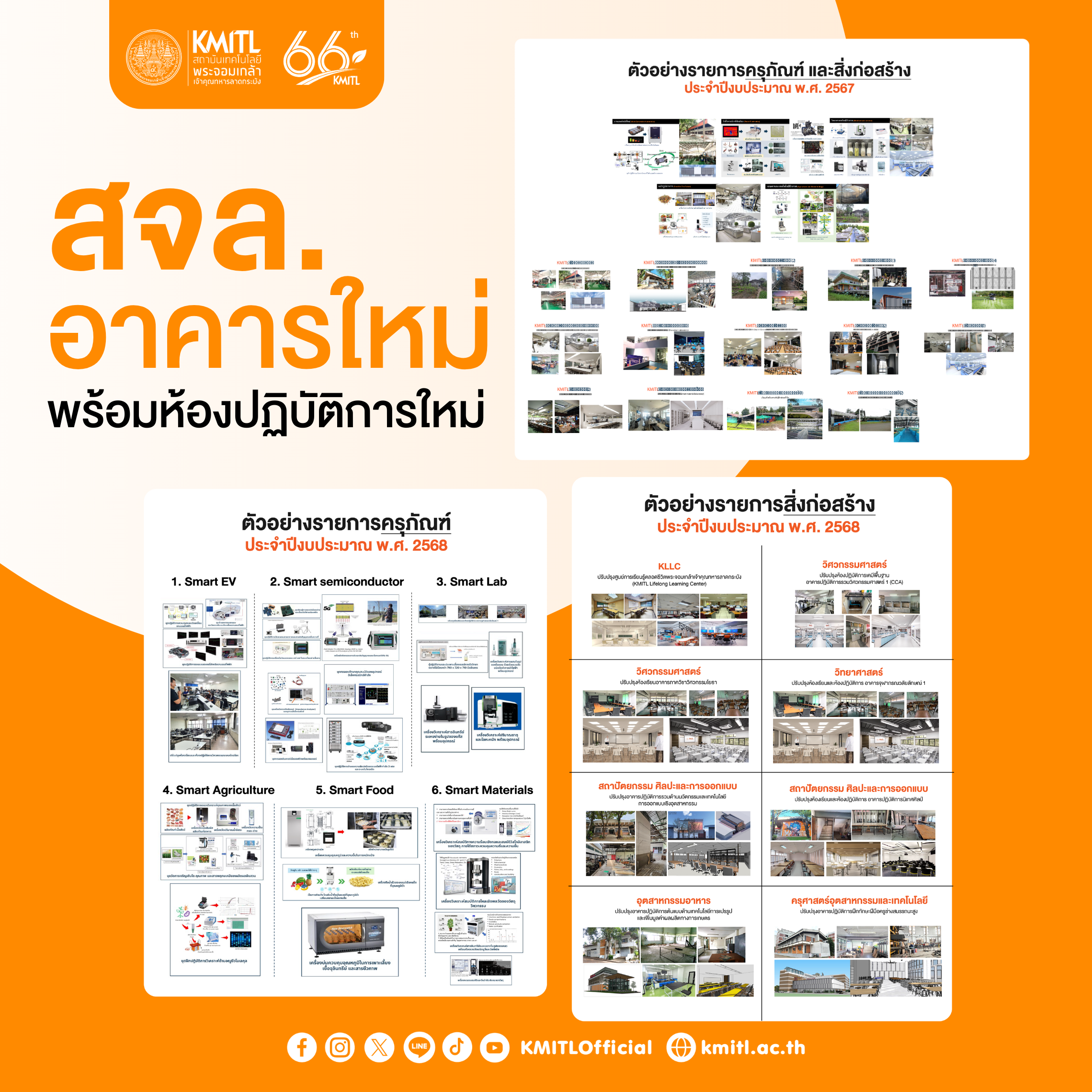 ตั้งแต่ห้องเรียน ห้องปฏิบัติการ ที่ทันสมัย ไปจนถึงสิ่งอำนวยความสะดวกที่ครบครัน ควบคู่การจัดหาครุภัณฑ์ ครบทุกด้าน ทั้ง Smart EV Smart Semiconductor Smart Lab Smart Agriculture Smart Food Smart Materials และเทคโนโลยีอัจฉริยะ