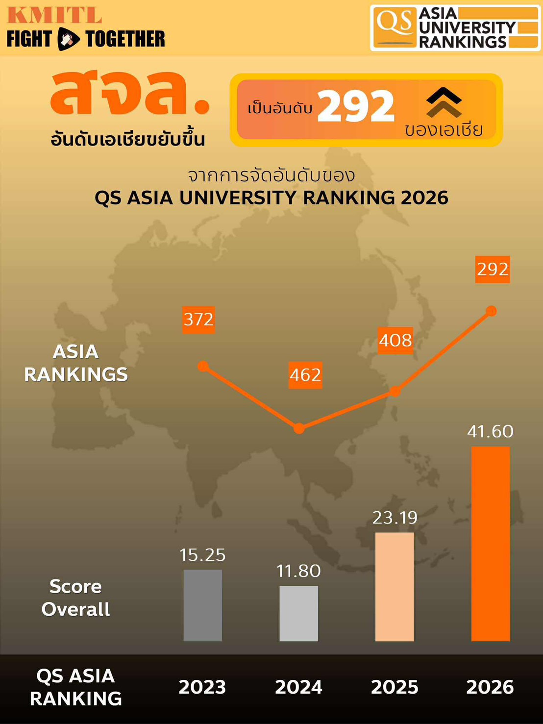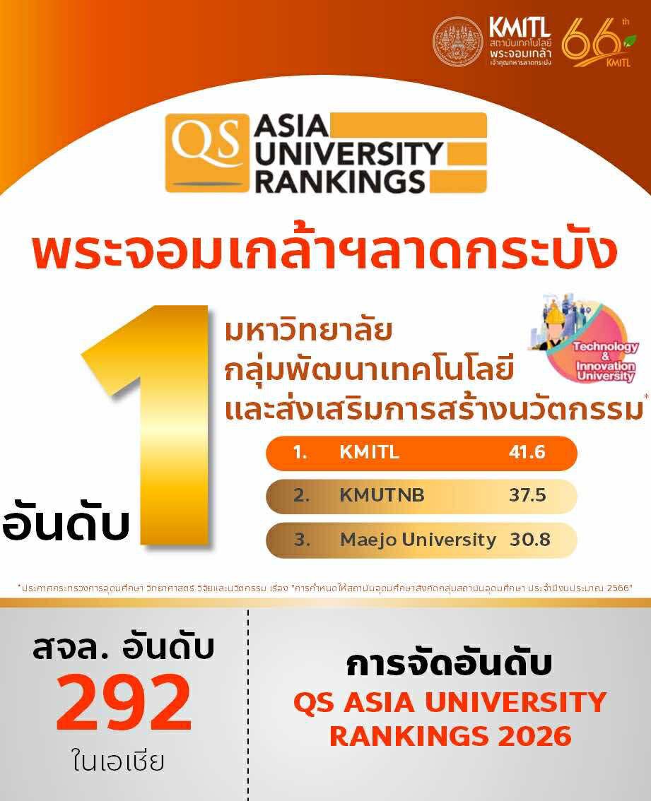 สถาบันเทคโนโลยีพระจอมเกล้าเจ้าคุณทหารลาดกระบัง (สจล.) ได้รับการจัดอันดับที่ 292 ในการจัดอันดับมหาวิทยาลัยระดับเอเชีย QS Asia University Rankings 2026