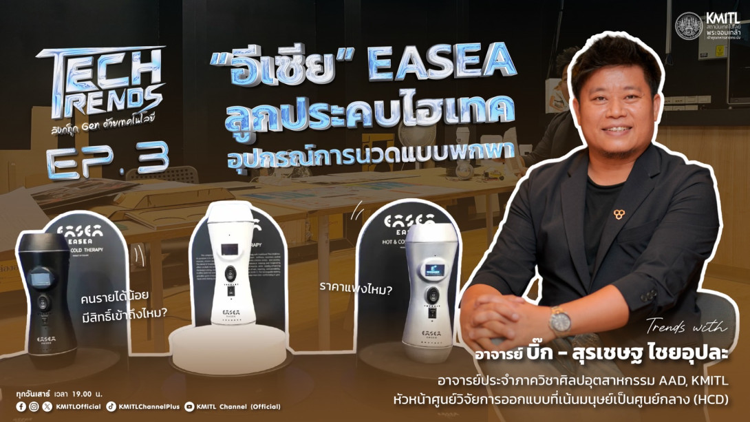 ติดตามได้ใน Tech Trends EP.3 “อีเซีย” #EASEA ลูกประคบไฮเทค กับ อาจารย์บิ๊ก สุรเชษฐ์ ไชยอุปละ อาจารย์ประจำภาควิชา ศิลปอุตสาหกรรม (AAD, KMITL) และหัวหน้าศูนย์วิจัยการออกแบบที่เน้นมนุษย์เป็นศูนย์กลาง (HCD)