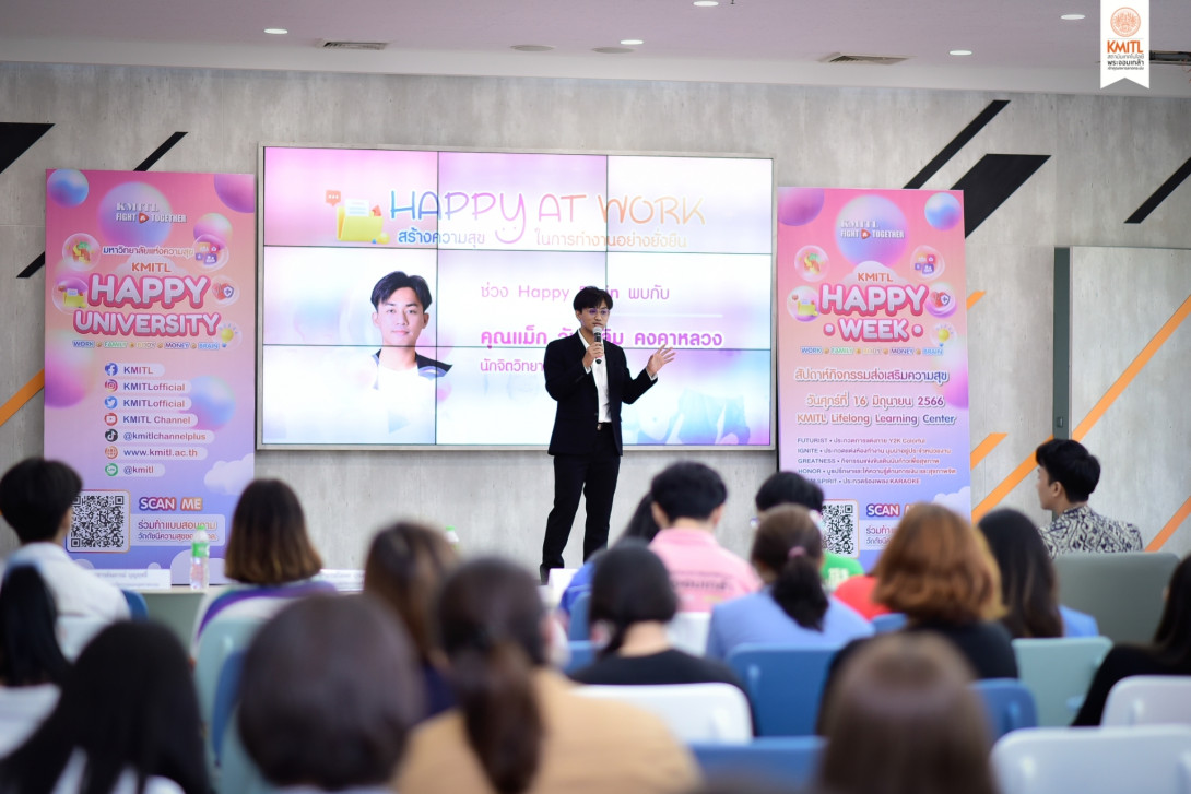 ซึ่งในวันที่ 16 มินายน ที่ผ่านมานี้ทาง สจล. ได้จัดกิจกรรม Happy Week ทั้ง 5 ด้าน ให้กับบุคลากร ไม่ว่าจะเป็น Happy Work , Happy Family , Happy Body , Happy Money , Happy Brain ซึ่งเราได้เชิญ คุณแม็ก วันเฉลิม คงคาหลวง นักจิตวิทยาปรึกษามาพูดคุยเสวนากันภายในงานด้วย และปัจจุบัน สจล. ยังเป็น 1 ใน 10 มหาวิทยาลัยในกำกับรัฐ ที่เข้าร่วมโครงการ Happy University และเราจะทำอย่างต่อเนื่องเพื่อก้าวสู่การเป็นมหาวิทยาลัยแห่งความสุขอย่างเต็มรูปแบบให้ได้