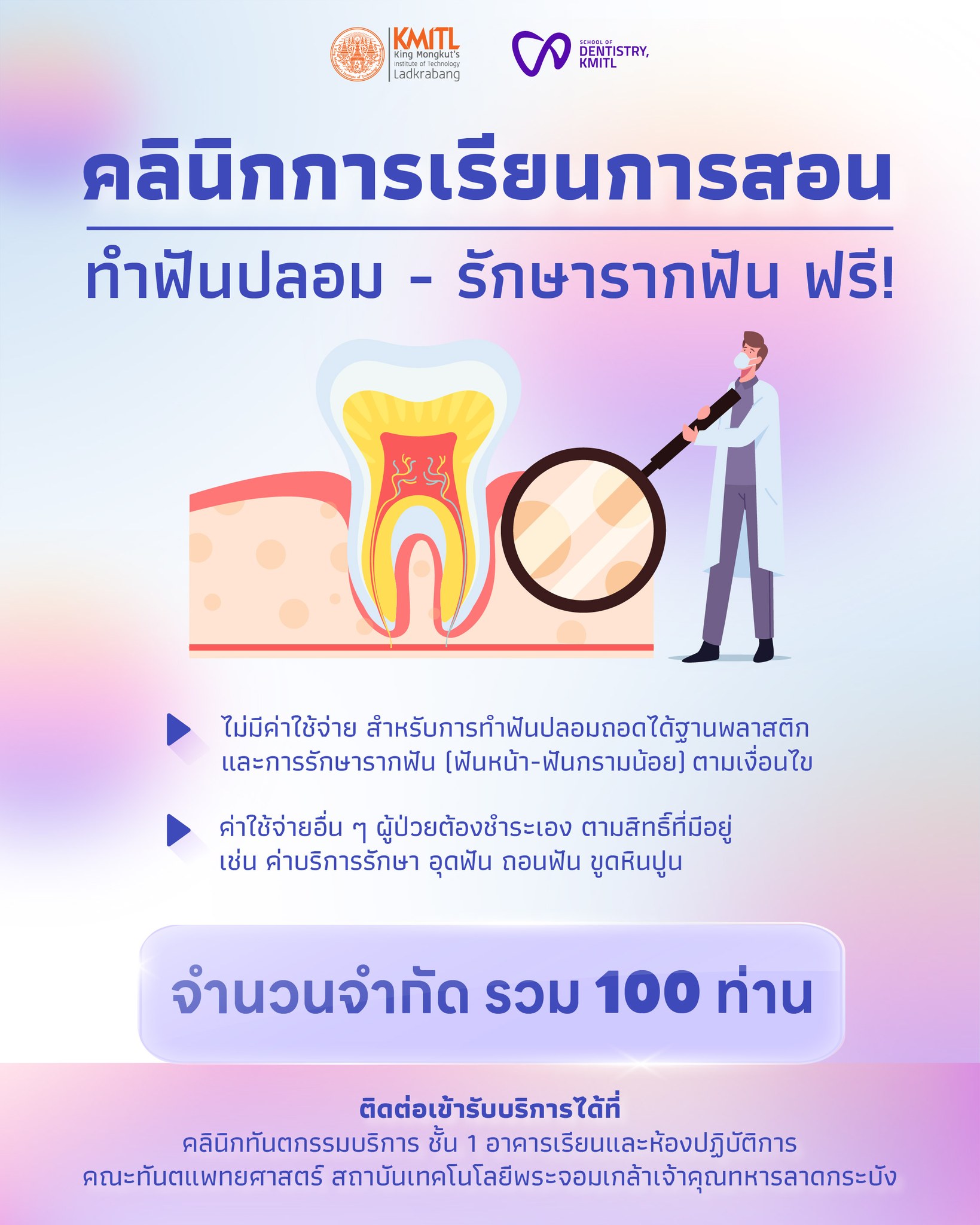 คณะทันตแพทยศาสตร์ สจล. เปิดให้บริการ ทำฟันปลอมถอดได้ฐานพลาสติก หรือรักษารากฟัน (ฟันหน้า–ฟันกรามน้อย)