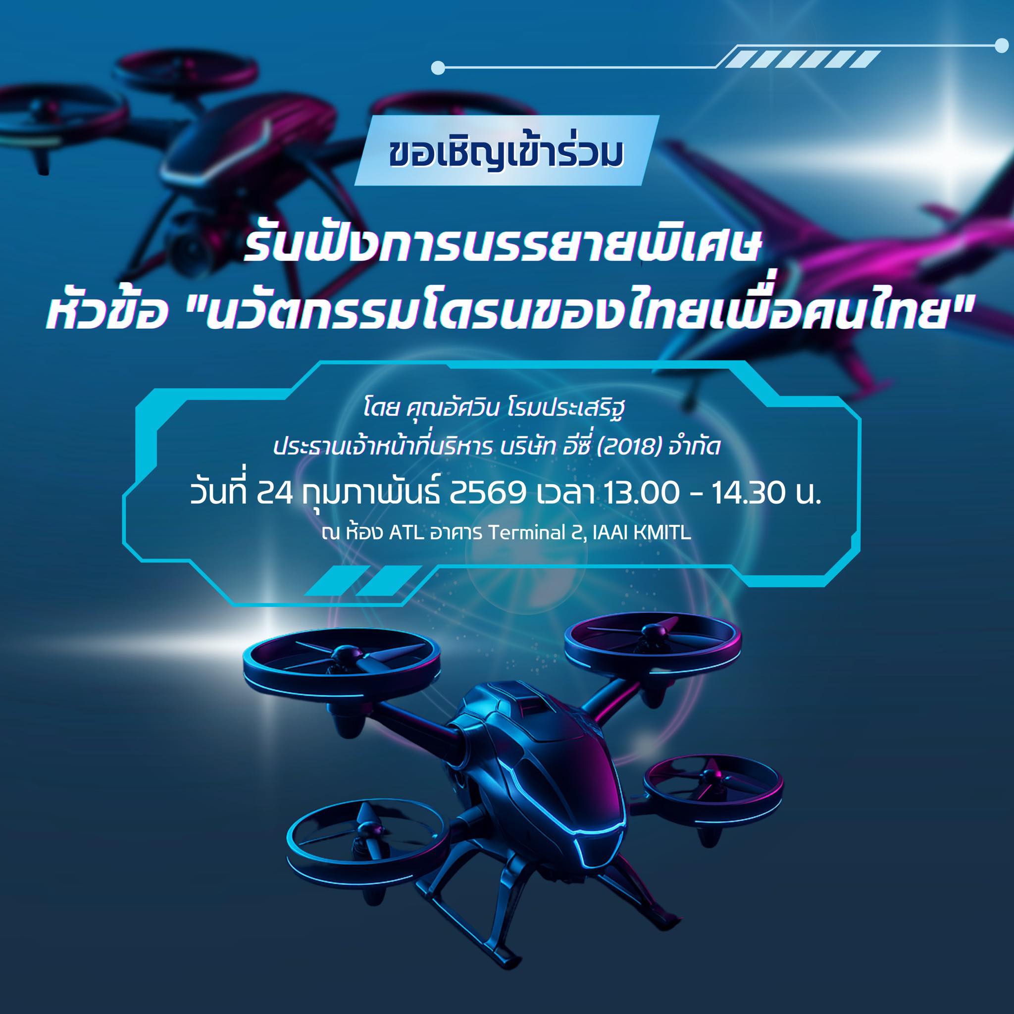 วิทยาลัยอุตสาหกรรมการบินนานาชาติ ขอเชิญผู้สนใจร่วมฟังการบรรยายพิเศษ เรื่อง "นวัตกรรมโดรนของไทยเพื่อคนไทย" ในวันที่ 24 กุมภาพันธ์ 2569 เวลา 13.00 - 14.30 น.  ณ ห้อง ATL อาาคาร Terminal 2, IAAI KMITL วิทยาลัยอุตสาหกรรมการบินนานาชาติ เพื่อให้ผู้เข้าร่วมได้รับมุมมองจากผู้บริหารภาคอุตสาหกรรมโดยตรงทั้งในด้านทิศทางเทคโนโลยีการต่อยอดนวัตกรรมสู่การใช้งานจริง และการเตรียมความพร้อมกำลังคนสำหรับอุตสาหกรรมการบินในอนาคต ซึ่งจะเป็นคุณูปการต่อการพัฒนาการศึกษาและระบบนิเวศด้านนวัตกรรมของประเทศโดยรวม