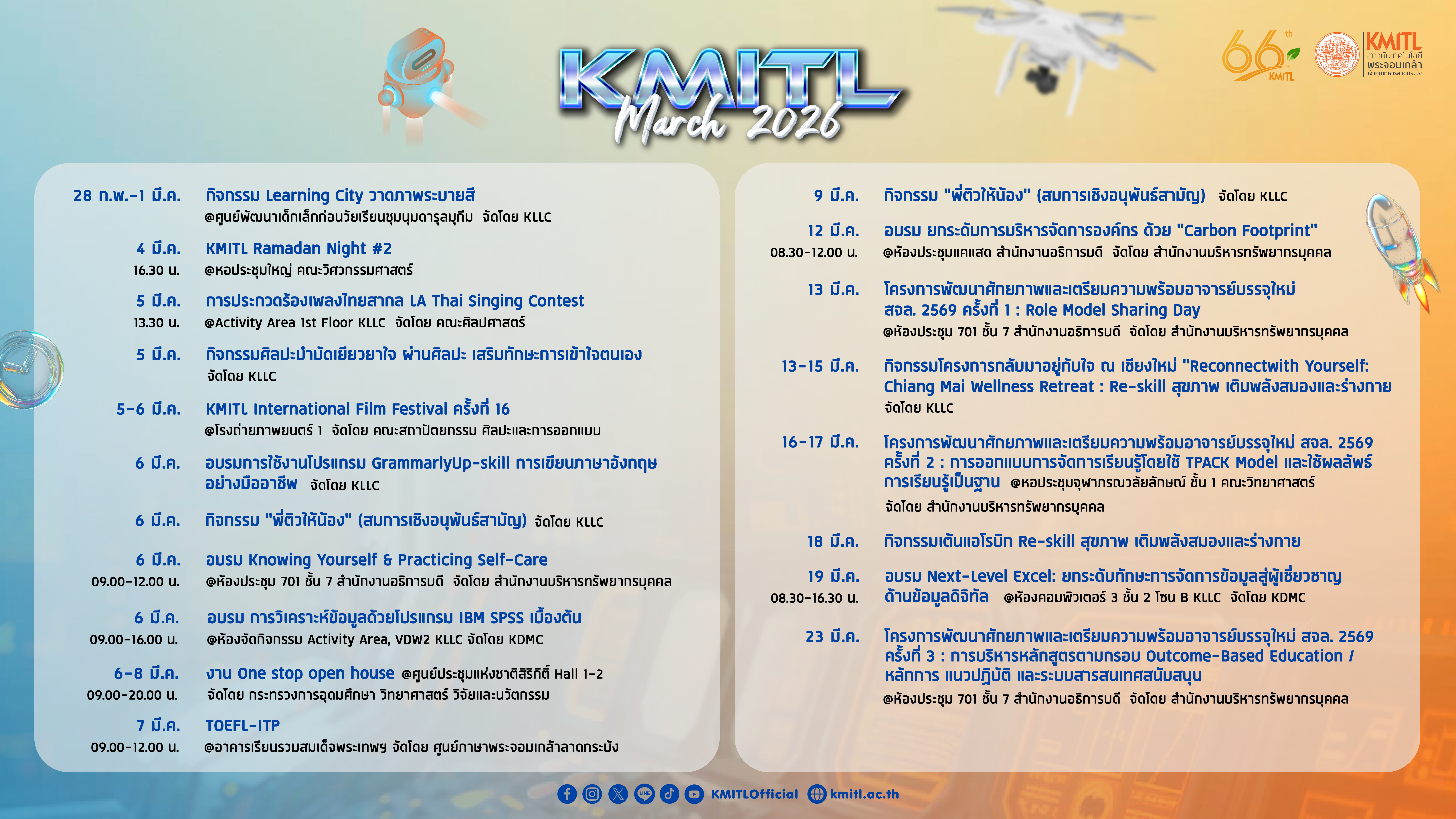 Start 06 Mar 2026 End 31 Mar 2026 ปฎิทินกิจกรรม ประจำเดือนมีนาคม 2569 #KMITL #สจล #พระจอมเกล้าลาดกระบัง #KMITLtogether Media gallery
