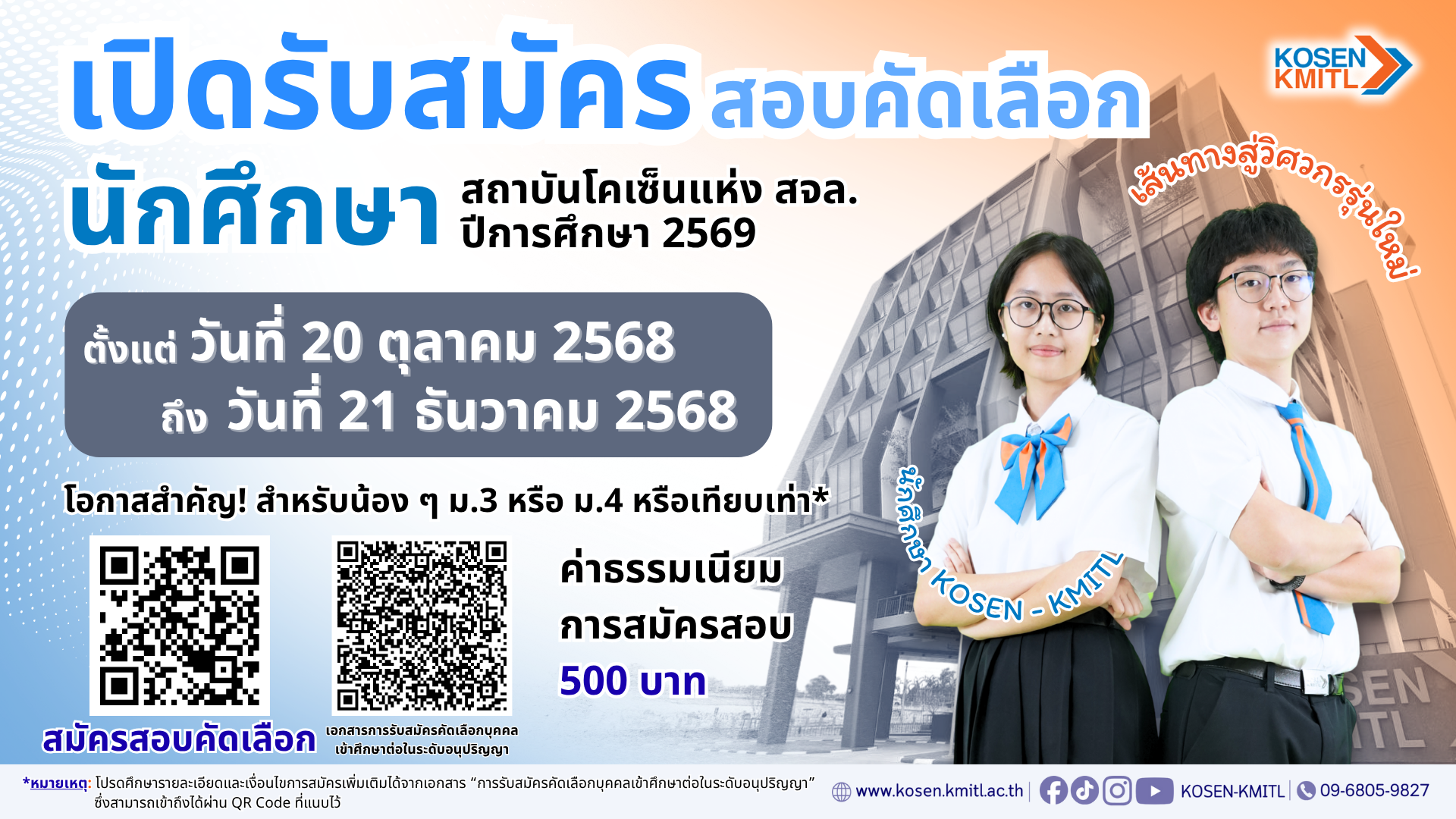 📩 สอบถามข้อมูลเพิ่มเติมได้ที่ admission_kosen@kmitl.ac.th หรือโทร. 096-805-9827